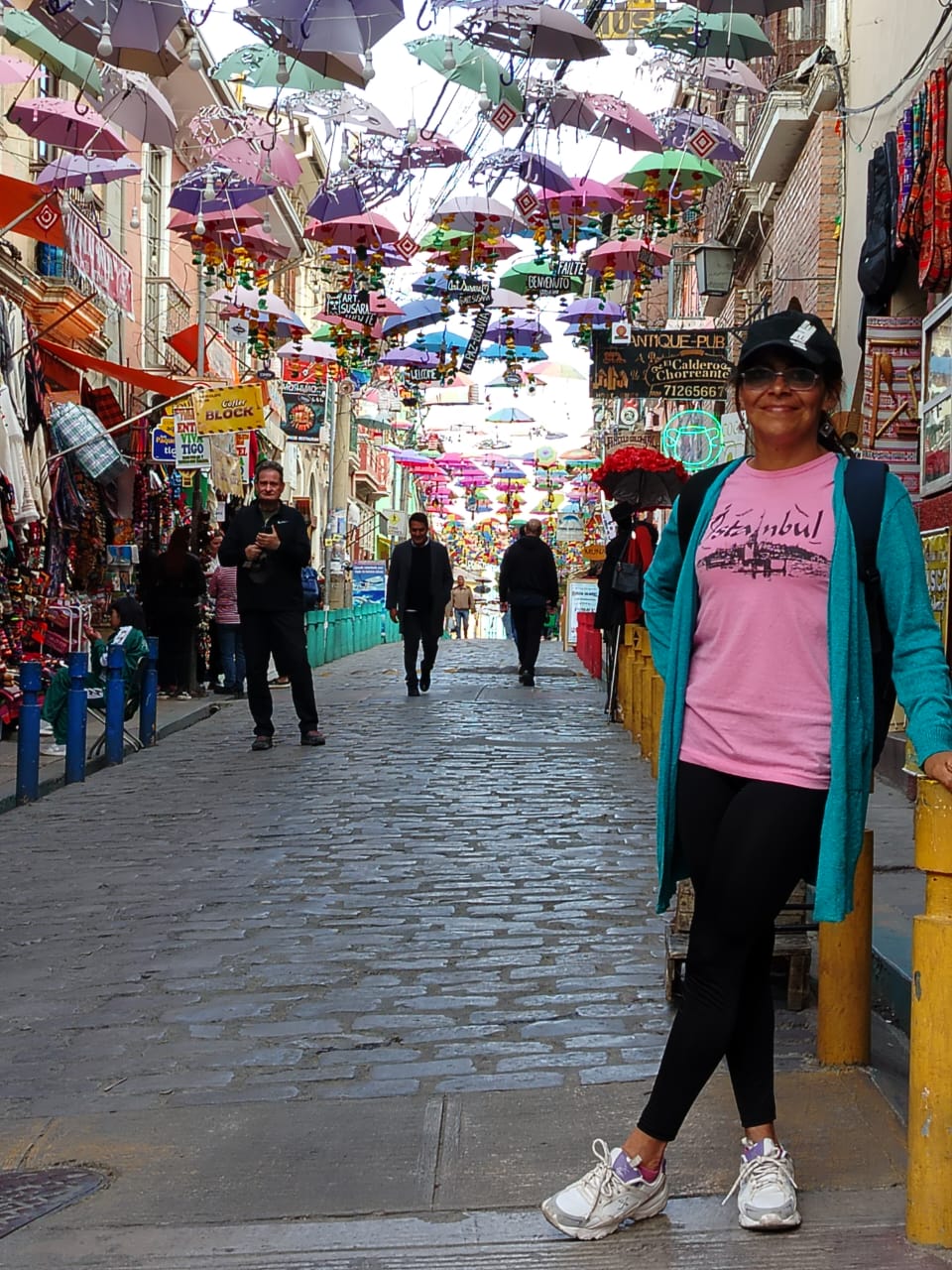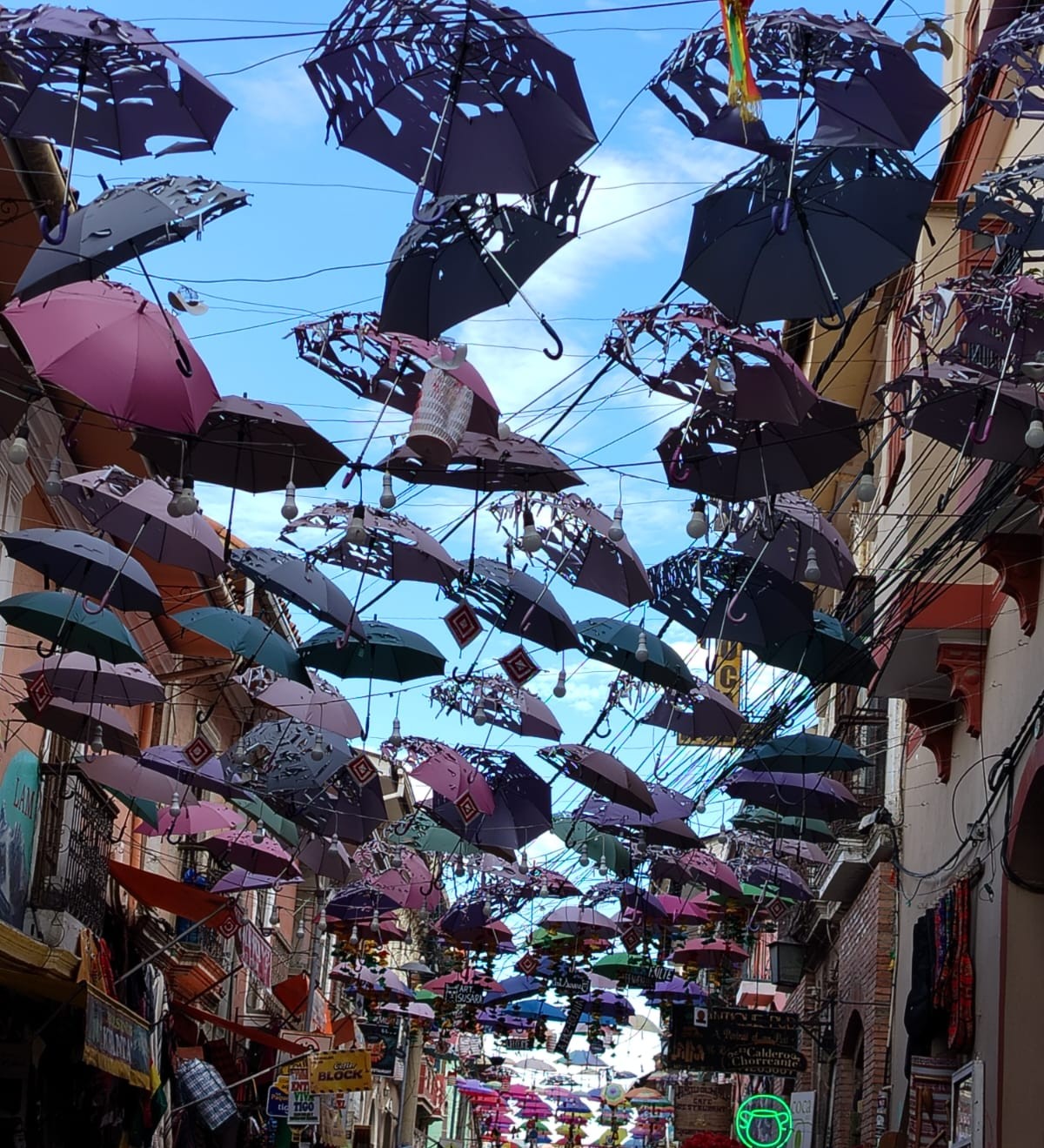 Al atardecer, mientras el sol se escondía detrás de las colinas, caminábamos por calles decoradas con paraguas de colores. Fue entonces cuando sentimos realmente la mezcla de lo moderno, lo tradicional y lo mágico de La Paz.