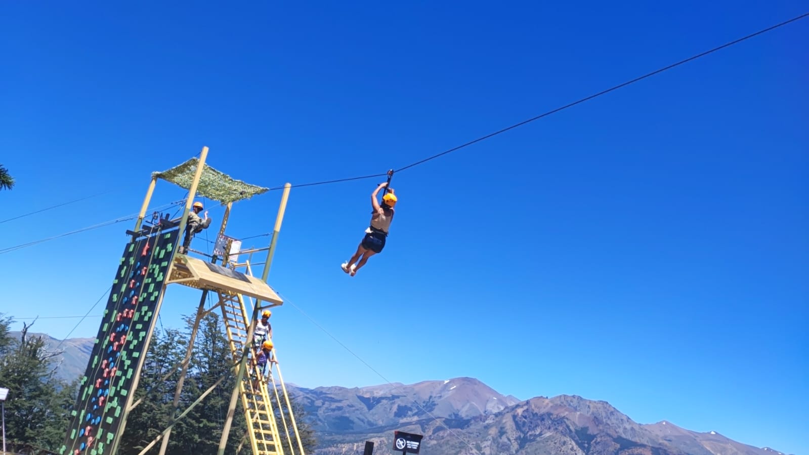un gran plataforma elevada, un muro de escalada y una tirolesa, formando un pequeño parque de aventura.