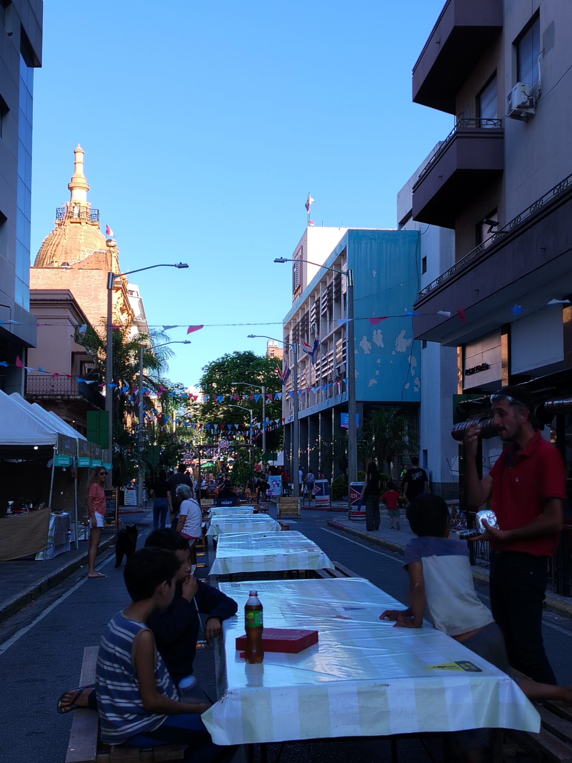 En la misma avenida había una feria temporal. La gente comía en los puestos callejeros y compraba artesanías y productos locales.